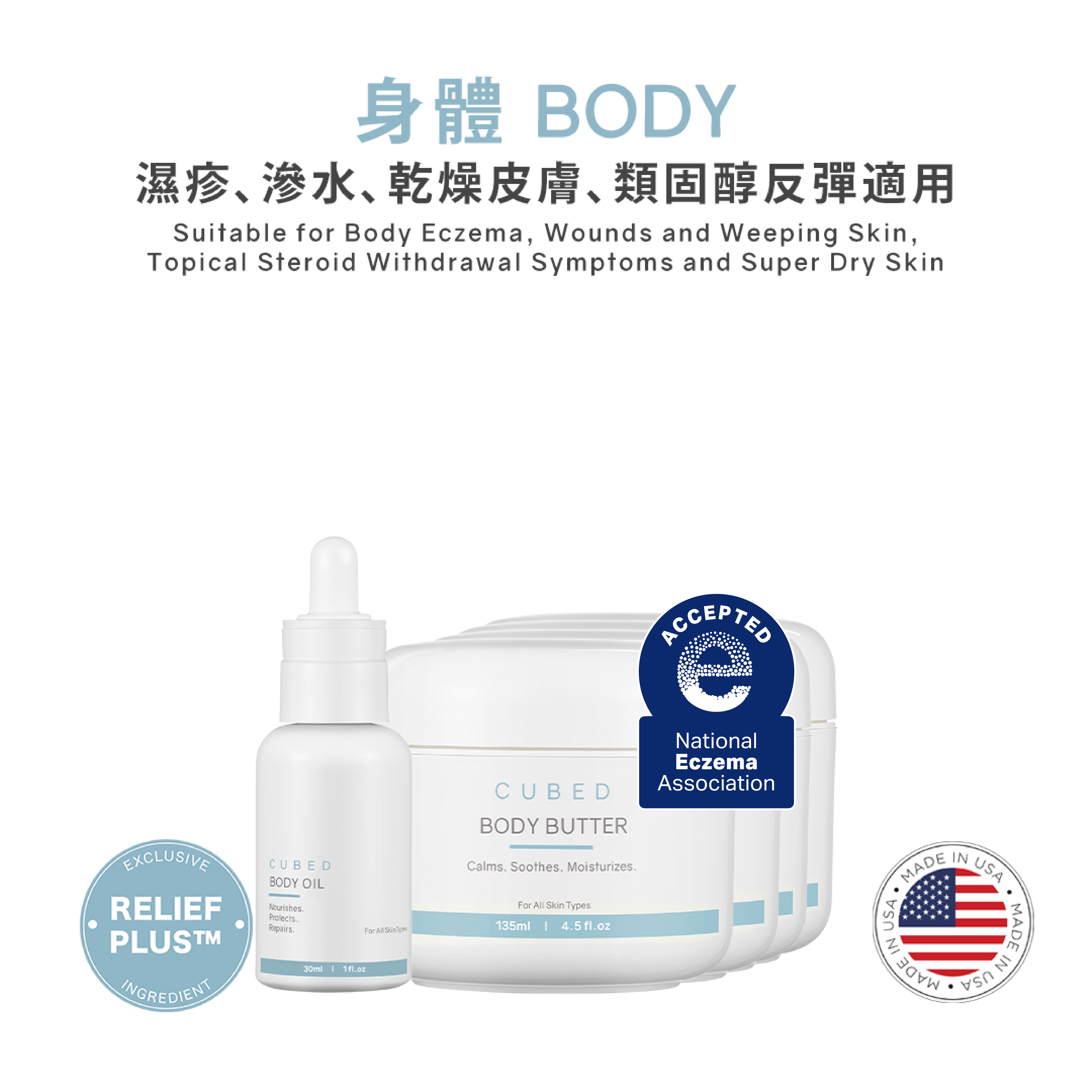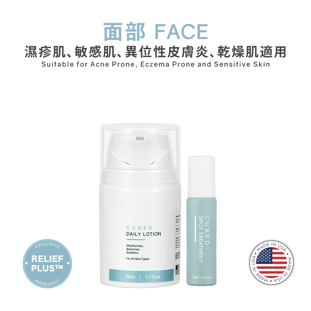CUBED 獨家研發複合成分Relief Plus™,能直接對付受損皮膚及發炎因子的成分。獨家成分Relief Plus™已提交申請專利。