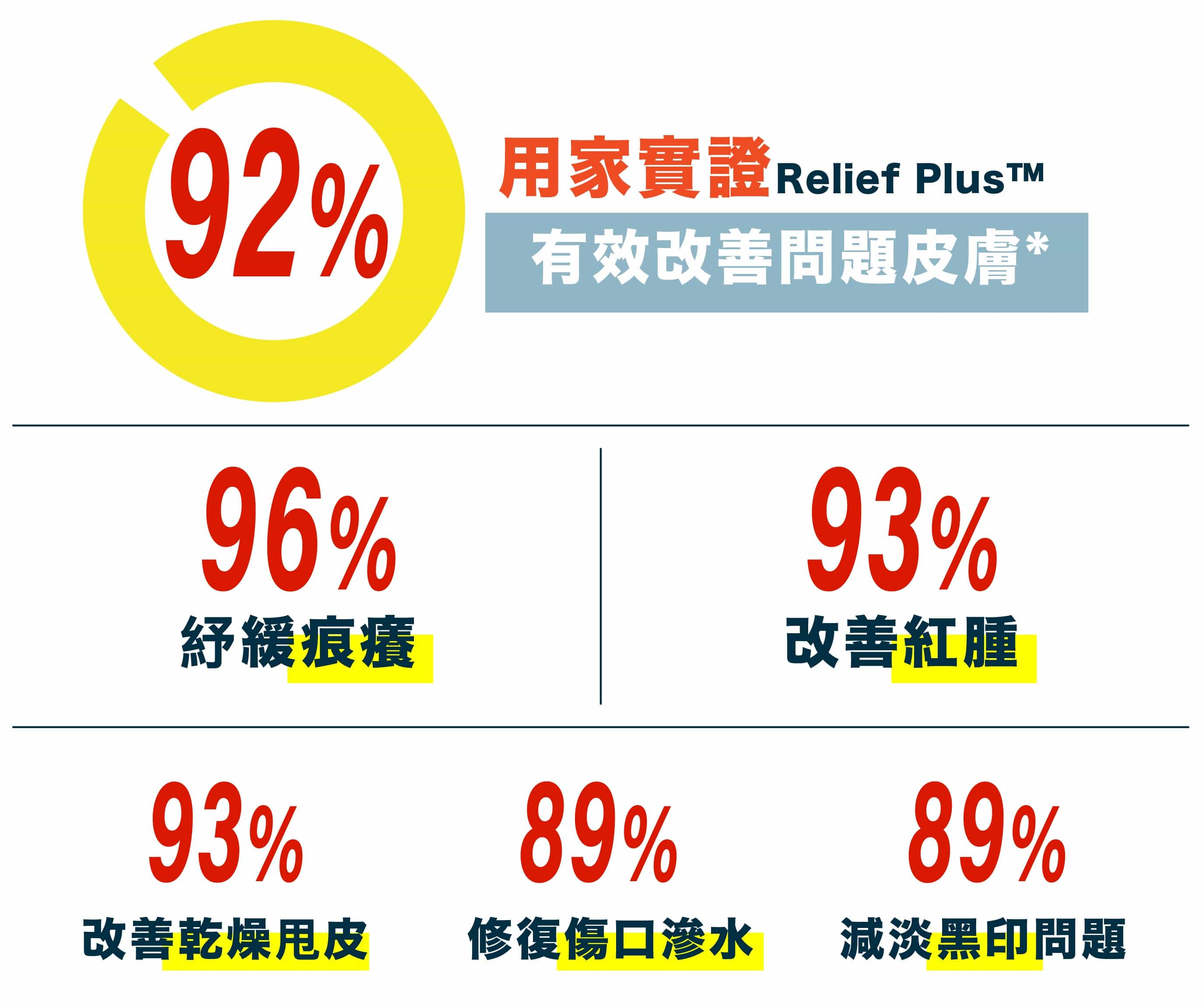 Relief Plus™有助促進健康細胞生長,以加快傷口癒合,尤其適合長期受損、乾燥、敏感不適的肌膚問題,讓受損肌膚自然再生,強化肌膚第一道防線,對抗外來侵害。